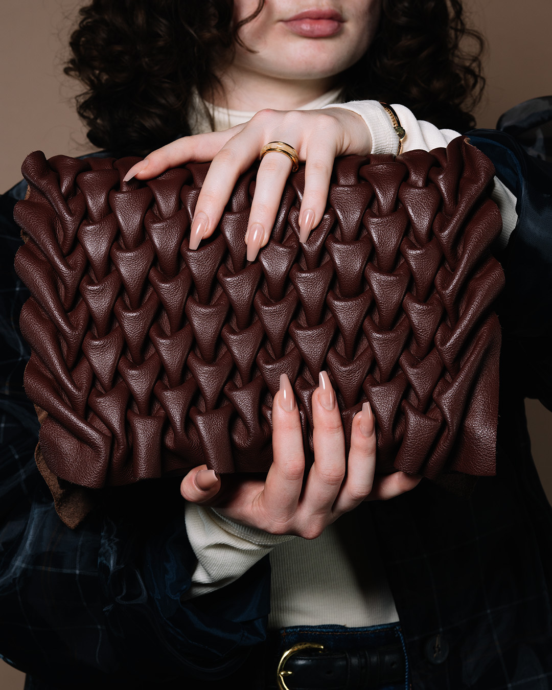 Triangular smocked handbag made with luscious nappa leathers intricately hand sewn to create a …